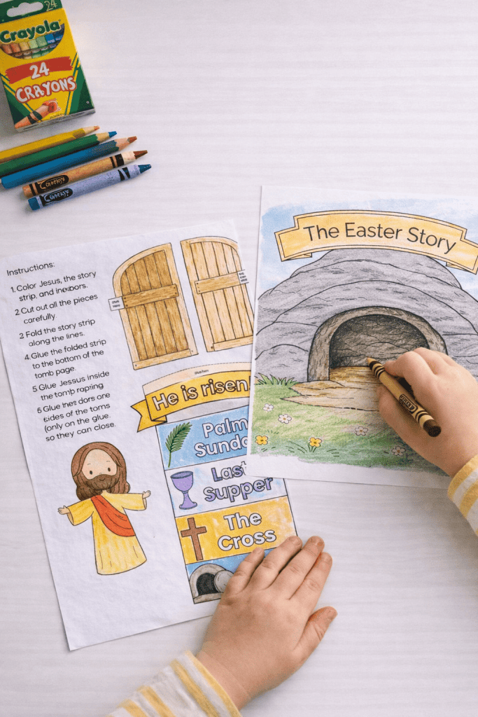 With just a few supplies and the free printable template, children can color, cut, fold, and build their own 3D resurrection scene with opening doors and a layered story strip.