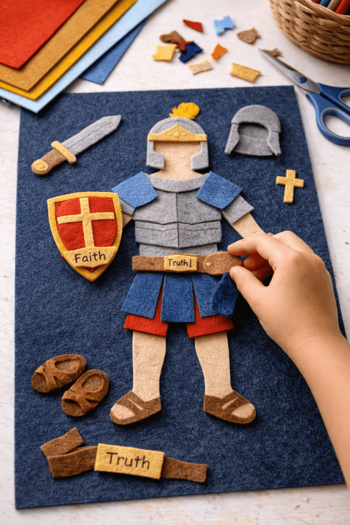 Cut each piece of armor from felt in different colors and create a felt board backdrop that looks like a knight or warrior silhouette. Kids place each piece of armor on the figure as you teach about it, which makes it interactive and story-like.