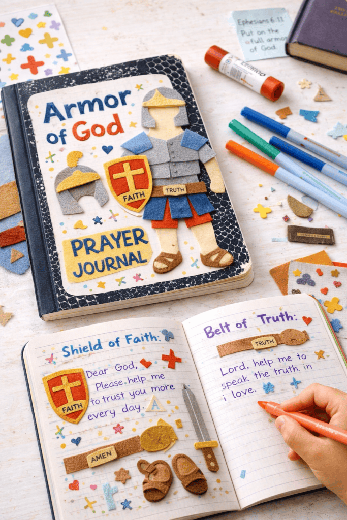 Inside, dedicate a section to each piece of armor where kids can write prayers, draw pictures, or journal about how that specific piece shows up in their daily life. For example, under the “Shield of Faith” section, they might write about a moment when they chose to trust God instead of worry.