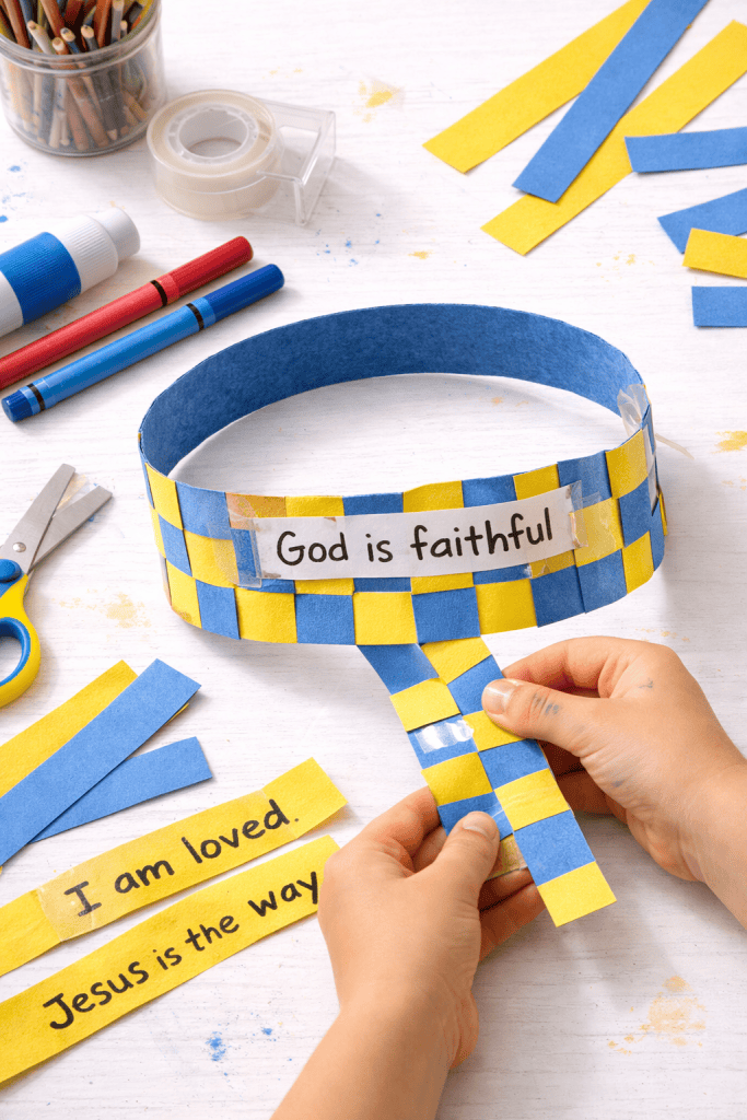For this one, you’ll cut strips of paper in two contrasting colors and have kids weave them together to create a belt or band. On each strip, kids can write one truth from scripture – things like “God is faithful,” “I am loved,” or “Jesus is the way.”