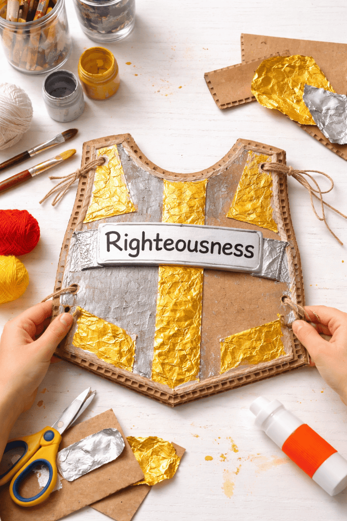 Cut a breastplate shape from a large piece of cardboard and let kids decorate it with gold and silver paint, foil stickers, or yarn. Write “Righteousness” across the center or add the verse Ephesians 6:14. Punch holes on the sides and thread ribbon or twine through to make it wearable.