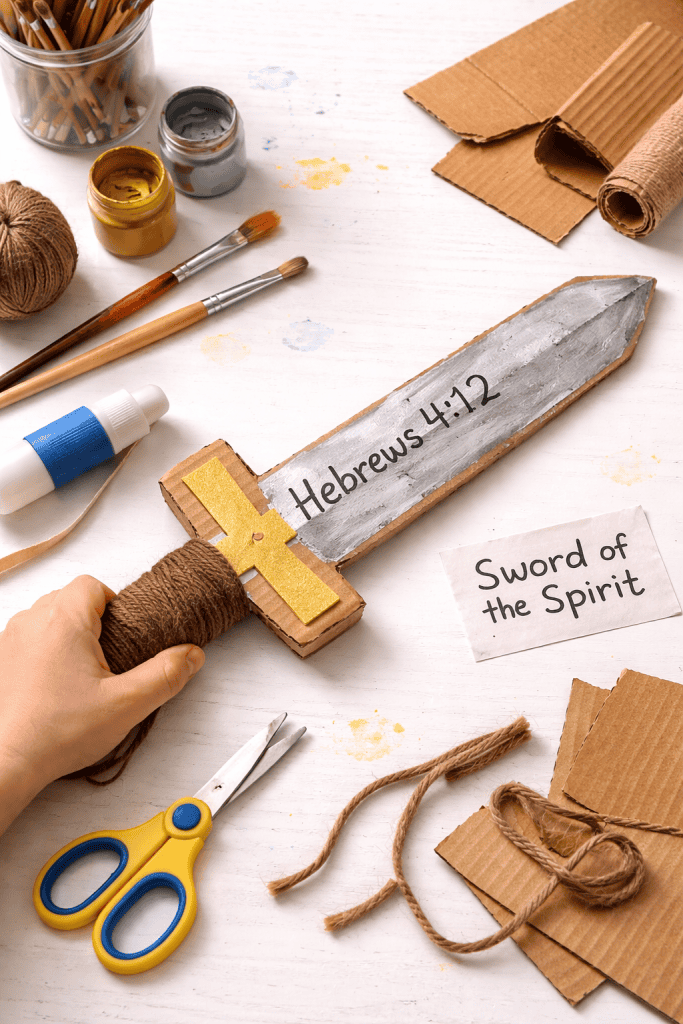 The Sword of the Spirit is the Word of God, and there is something wonderfully symbolic about letting kids craft their very own sword from cardboard. Cut a sword shape, wrap the handle in brown yarn or craft foam, and paint the blade silver or gray.