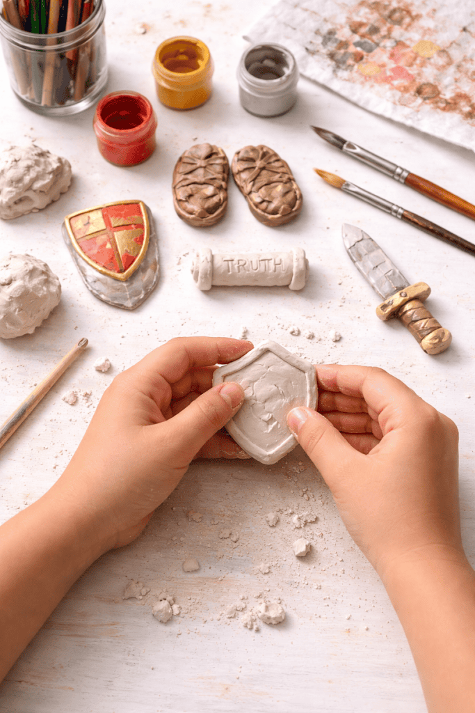 Using air-dry clay or homemade playdough, let kids mold each piece of the Armor of God as a miniature set. A tiny shield, helmet, sword, breastplate, sandals, and a scroll for the Word of God – each one is shaped by their own hands. Once dry, paint them and display them on a tray or in a shadow box.