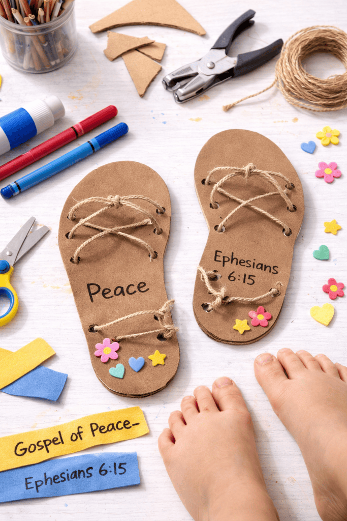 Trace each child’s foot onto brown craft foam or cardboard and cut out the sandal shapes. Punch holes along the sides and lace with twine or ribbon. On the sole, write “Peace” or “Gospel of Peace – Ephesians 6:15.”