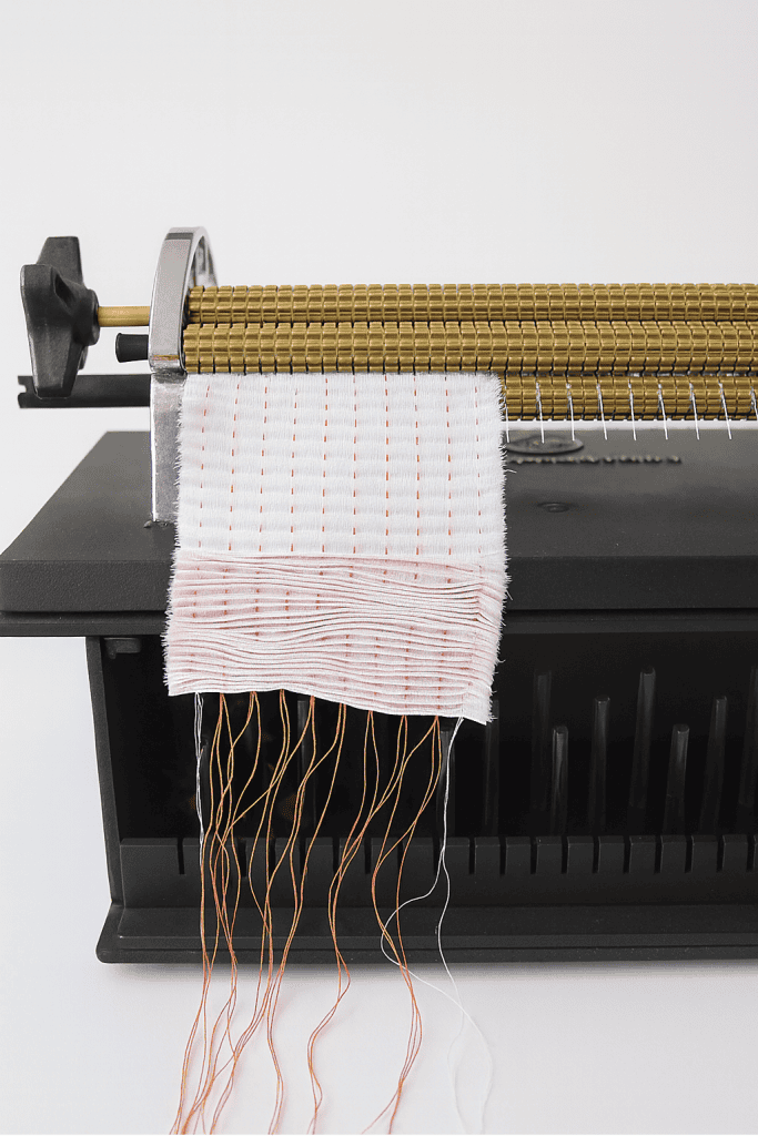 With just a turn of the handle, fabric feeds through and forms even pleats, ready for stitching or embroidery.