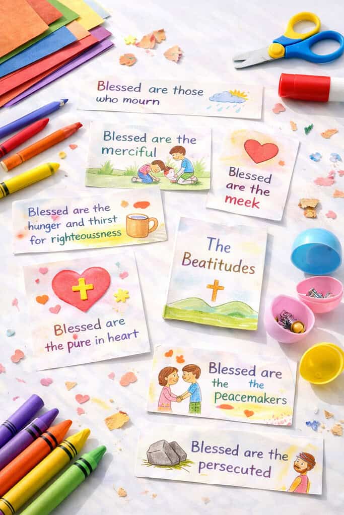 The Beatitudes from Matthew 5 are pure gold — and making a craft around them helps kids actually memorize and understand them. Each beatitude can be illustrated on its own card, banner strip, or page in a mini-booklet.