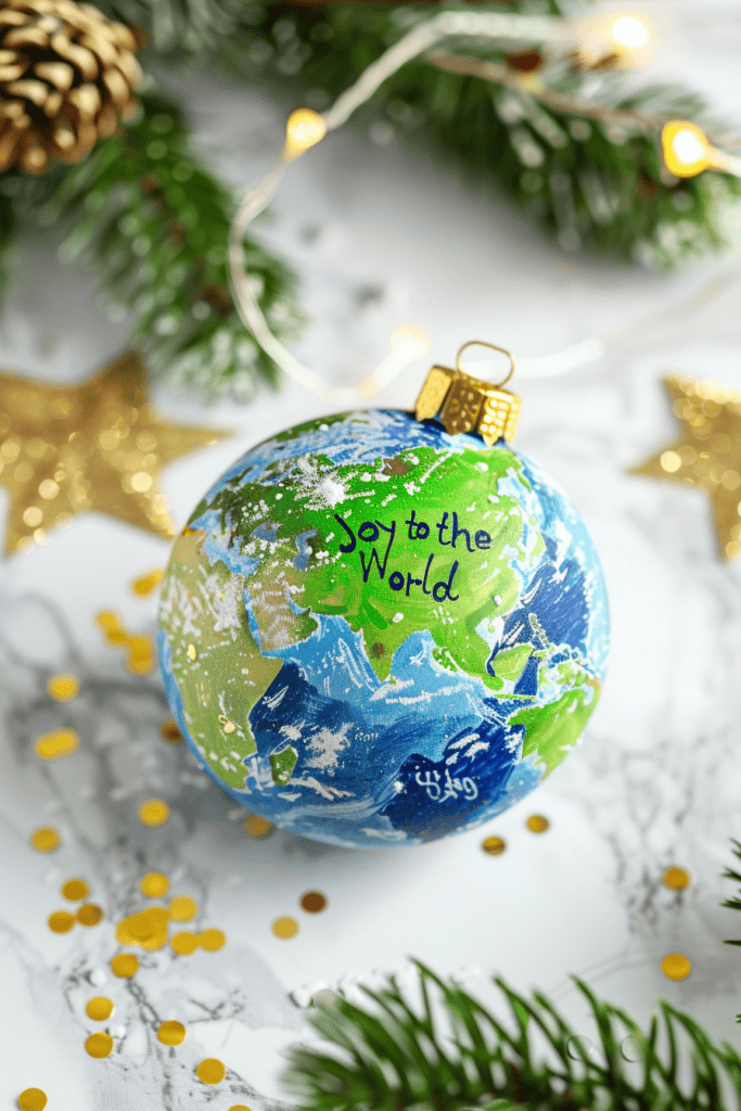 Materials: foam ball or paper globe template, blue and green paint or markers, thin ribbon or string, and a fine-tip pen.