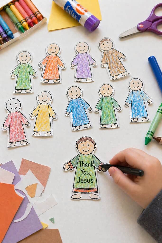 Cut ten simple stick-figure shapes from cardstock. Kids color all ten and then decorate one differently — the one who came back. Have them write “Thank You, Jesus” on his tunic. Sit with gratitude. Notice how easy it is to receive and forget to return. I chew on this one myself more than I’d like to admit.