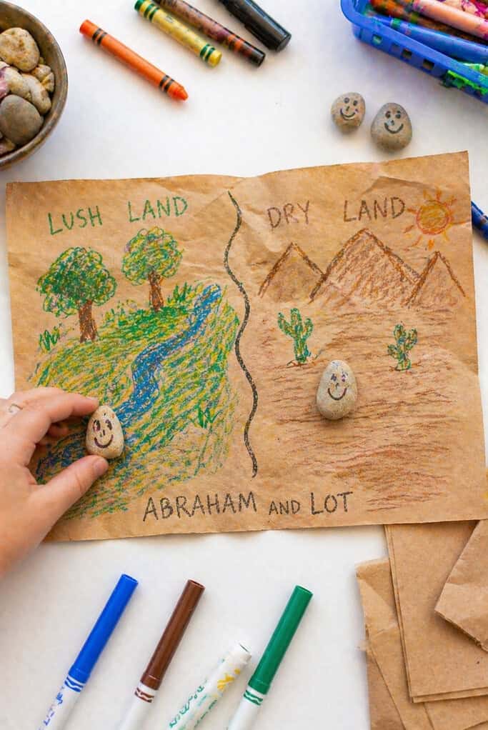 Use a simple map drawn on brown paper — mark two regions, one lush and one dry. Let kids move little pebble “people” to their chosen lands. Marvel at Abraham’s generosity in letting Lot choose first. Sit with what it looks like to trust God when you’ve given up the better option.
