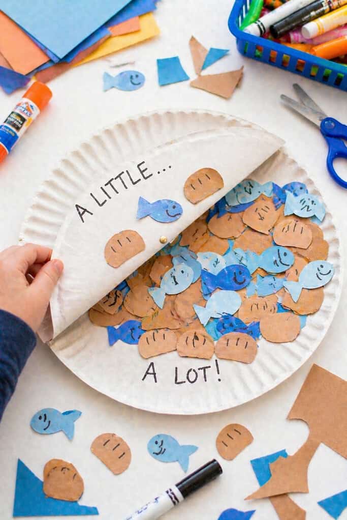 Give each child a paper plate. On one side, glue just a few fish and bread cutouts. On the other side, let them fill the plate with many more pieces. Flip it to show the miracle of multiplication.