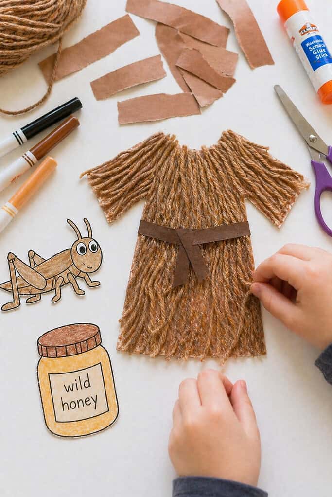 Kids cut a simple robe shape and glue on camel-colored yarn or brown paper strips for texture. Add a paper locust (it is what it is) and a little jar labeled “wild honey.” Explore John’s role as the voice in the wilderness. Reflect on what it means to prepare the way.