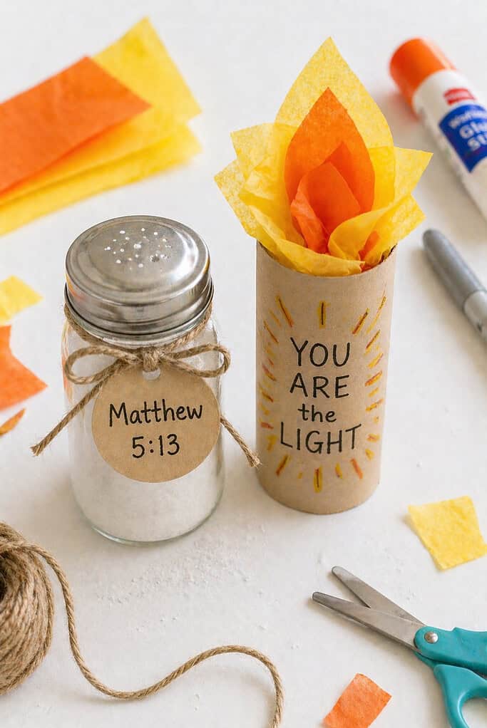Two simple parts to this one. For “salt,” let kids fill a small jar or bag with salt and write Matthew 5:13 on a tag. For “light,” cut a candle flame from yellow tissue paper and glue it to a toilet paper roll. Wrestle together with what it means to be salt and light in a world that needs both.