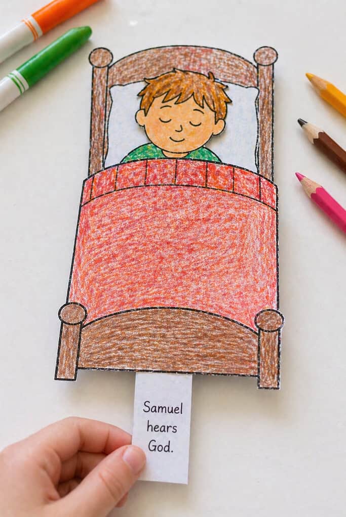Make a simple “bed” from a folded piece of felt or construction paper. Cut a small figure for Samuel. Recreate the moment he heard his name called in the night — three times — and finally answered. Let kids practice saying “Speak, Lord, your servant is listening.”
