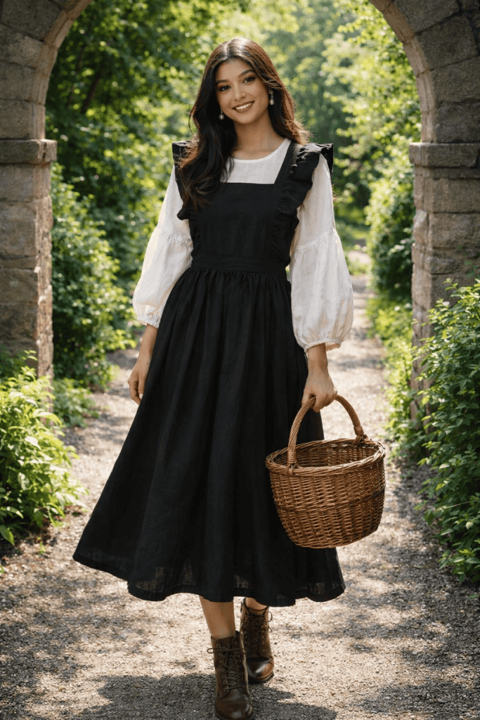 The pinafore is a versatile favorite in both cottagecore and shabby chic style.