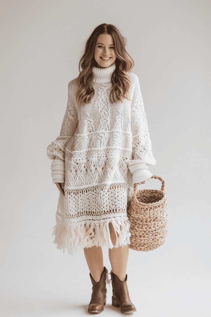 This combination highlights balance between delicate and cozy pieces.