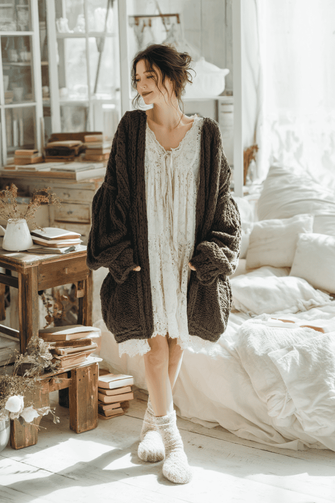 34. Cozy reading: oversized shabby chic cardigan, lace dress, knitted socks