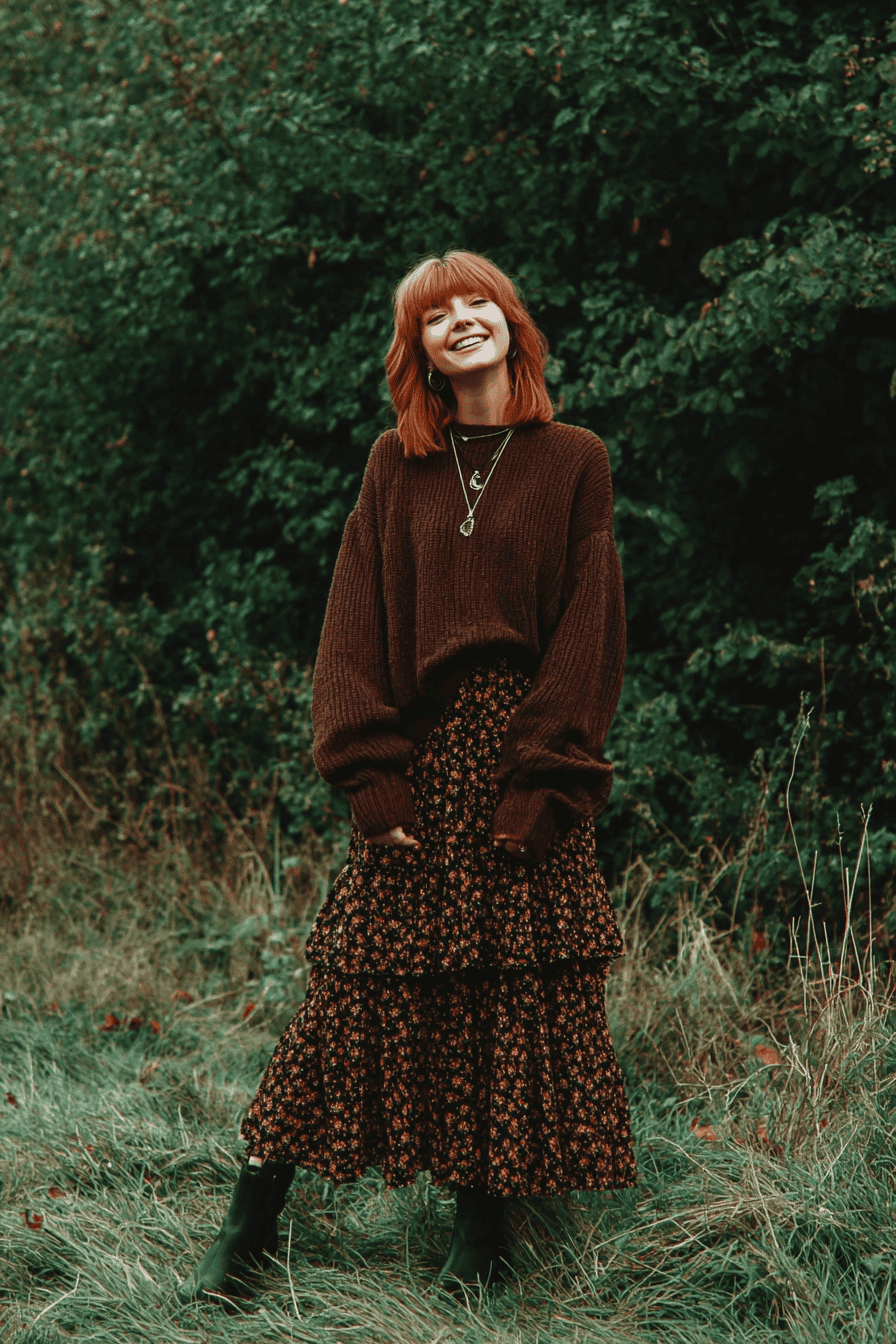 33. Country walk: wool jumper, corduroy skirt, shawl