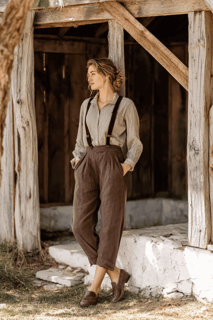 32. Gardening outfit: linen pinafore, cotton blouse, lace-up boots