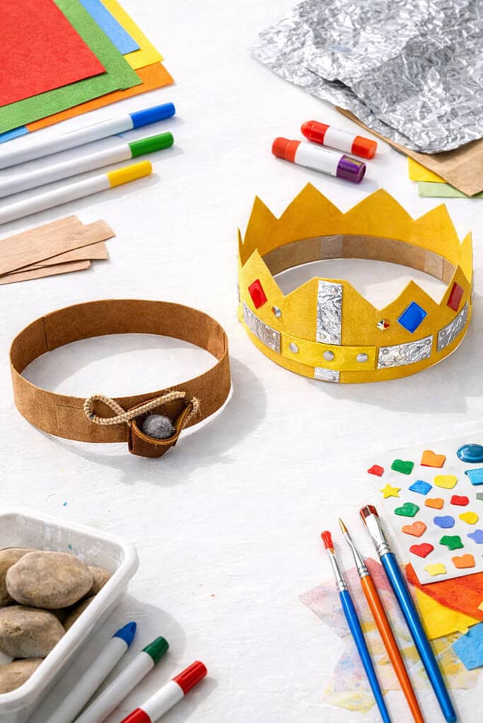 Let kids choose their character – are they David or Goliath? – and make a matching accessory to wear while you read or act out the story. David’s headband can be simple brown or tan paper with a small sling attached, while Goliath’s crown can be gold paper with foil details and pretend jewels.