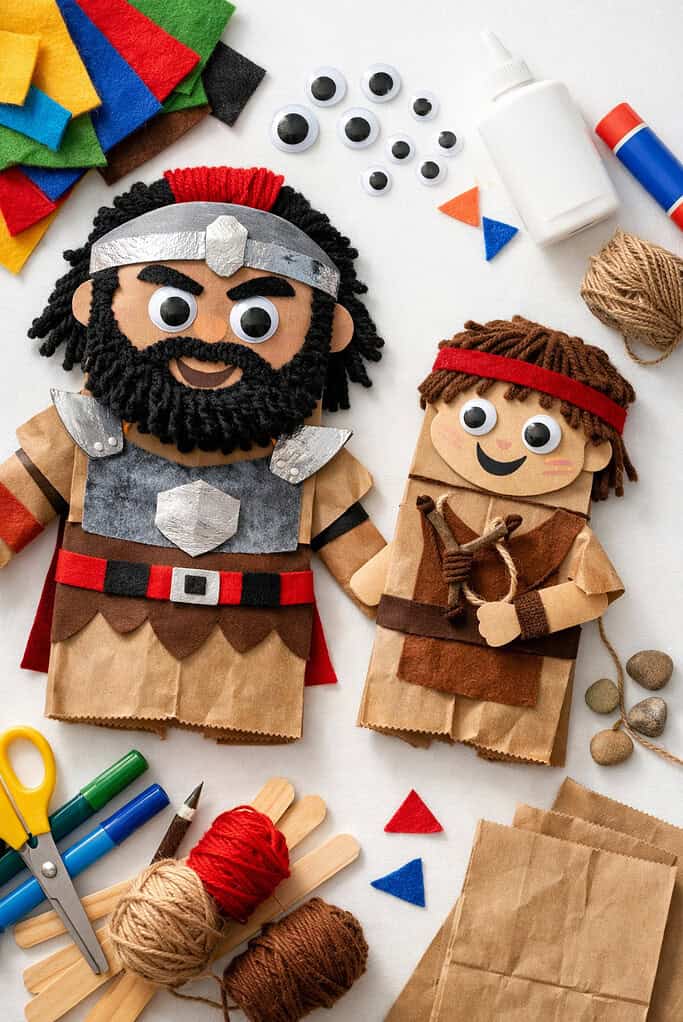 Paper bag puppets or stick puppets let kids become the storytellers themselves – and there’s something truly magical about watching a child retell a Bible story in their own words. Make a David puppet and a Goliath puppet, then let the kids act out the scene.