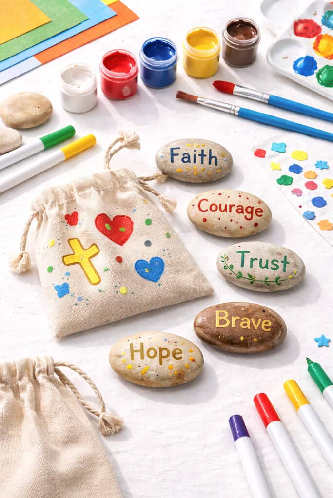 Each stone can represent something like faith, courage, trust, hope, or bravery. Kids can think of it as their little “bravery kit” they can take home and keep nearby as a reminder that God helps them face their own giants.