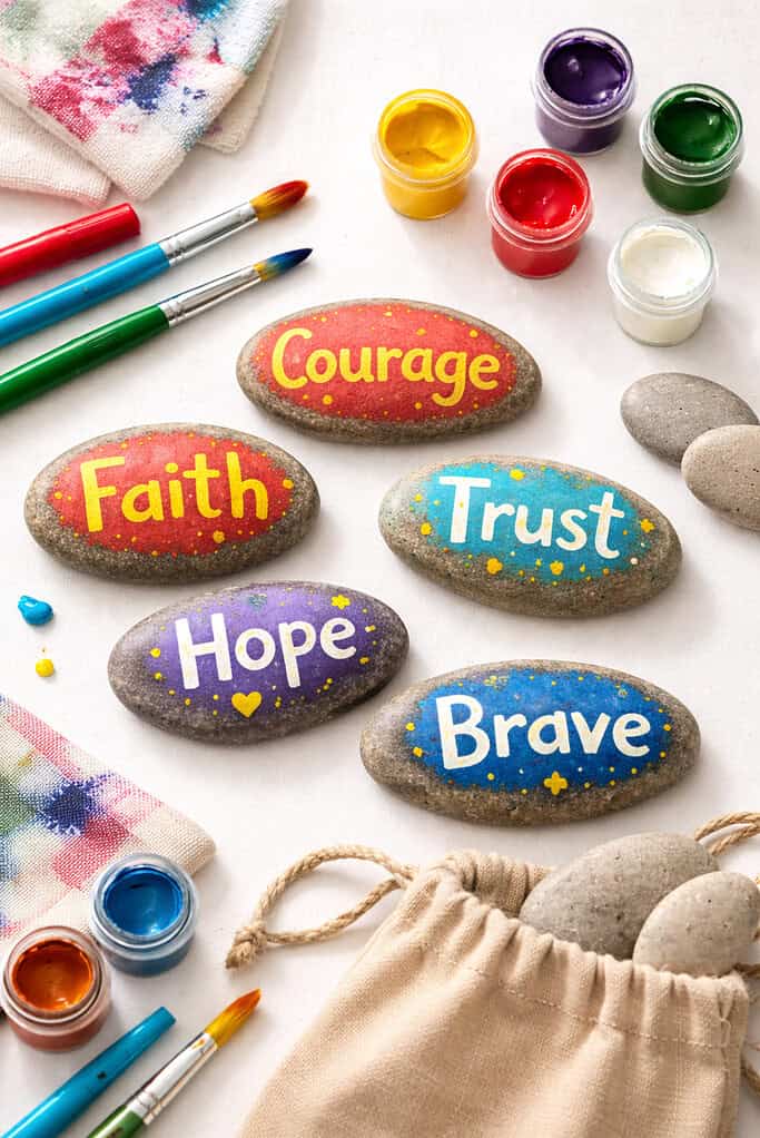 There’s something so grounding about holding actual stones in your hands while talking about this story. Have kids collect five smooth stones from outside (or grab some from a craft store), then paint or write a word on each one – things like Faith, Courage, Trust, Hope, or Brave.