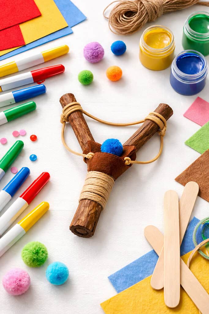 This one is always a crowd-pleaser. Kids can make their very own mini slingshot using craft sticks, rubber bands, and a small piece of felt or fabric for the pouch.