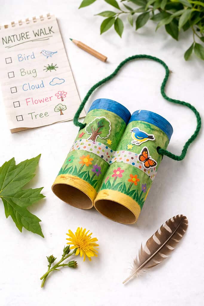 Tape two toilet paper or paper towel rolls side by side, decorate them however you like, punch holes on the outer edges, and string a piece of yarn through as a neck strap. Then head outside for a nature walk where the binoculars are the star of the show.