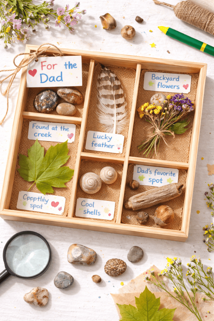 If Dad is the kind of person who loves the outdoors, a shadow box or small tray filled with nature finds — interesting rocks, pressed leaves, a feather, dried flowers, a piece of driftwood — makes a simple but genuinely lovely display.