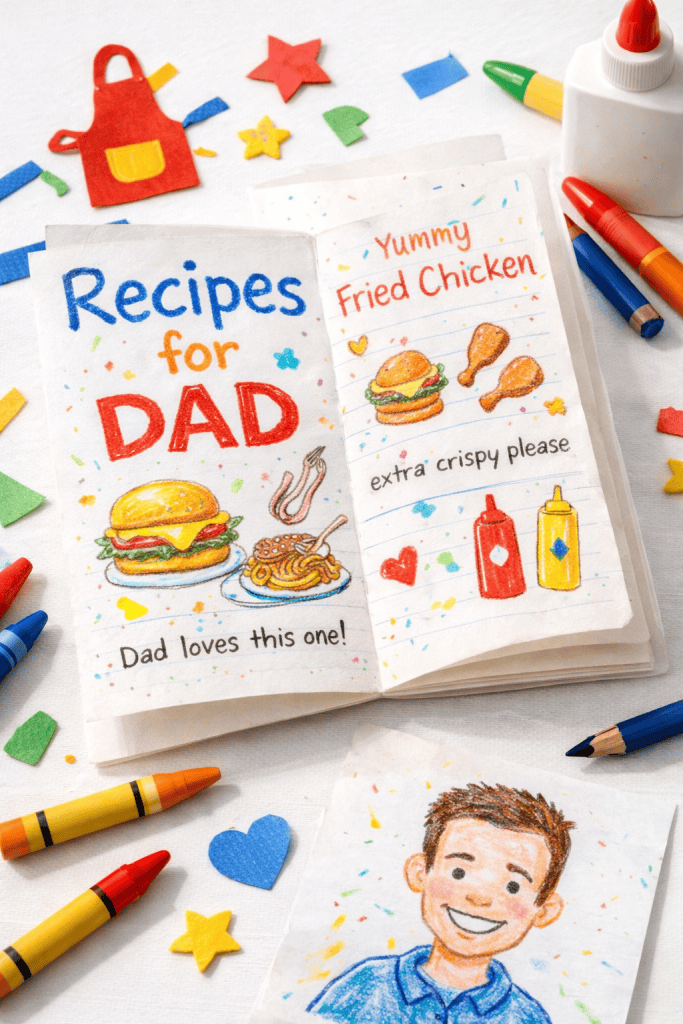 Ask your child to write down (or dictate) their dad’s top five or ten favorite meals. It doesn’t have to be a full cookbook — even a simple folded booklet with hand-drawn food illustrations and short descriptions makes for something completely personal.