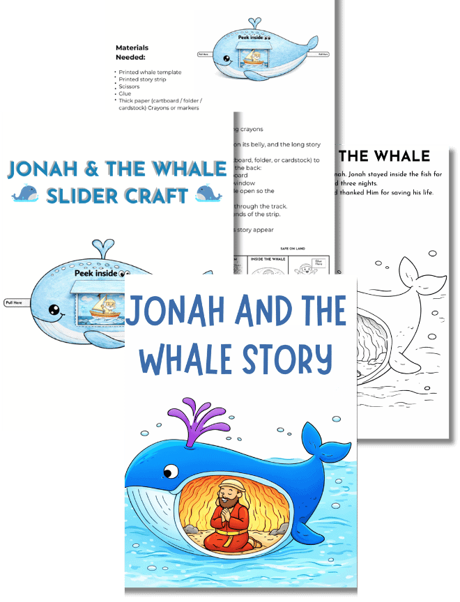 The slider craft features a pull-tab whale your kids color and assemble, then slide through five sequential scenes—from Jonah running away all the way to his safe return to land. The coloring storybook goes even deeper, with eight illustrated pages covering the full narrative, including God’s lesson about mercy and compassion that often gets left out.