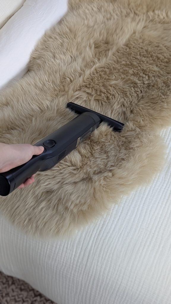 You can vacuum a sheepskin rug to pick up dust, but do it with care.