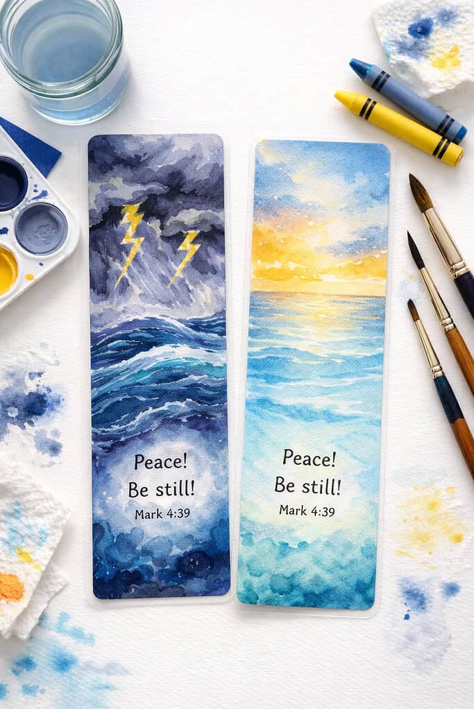 On the other side, they paint a calm, still ocean with soft golden sunlight. A printed Bible verse like Mark 4:39 ties it all together. Laminate them when dry for a bookmark they’ll keep for years. It’s also a wonderful reminder that peace is always on the other side of the storm.