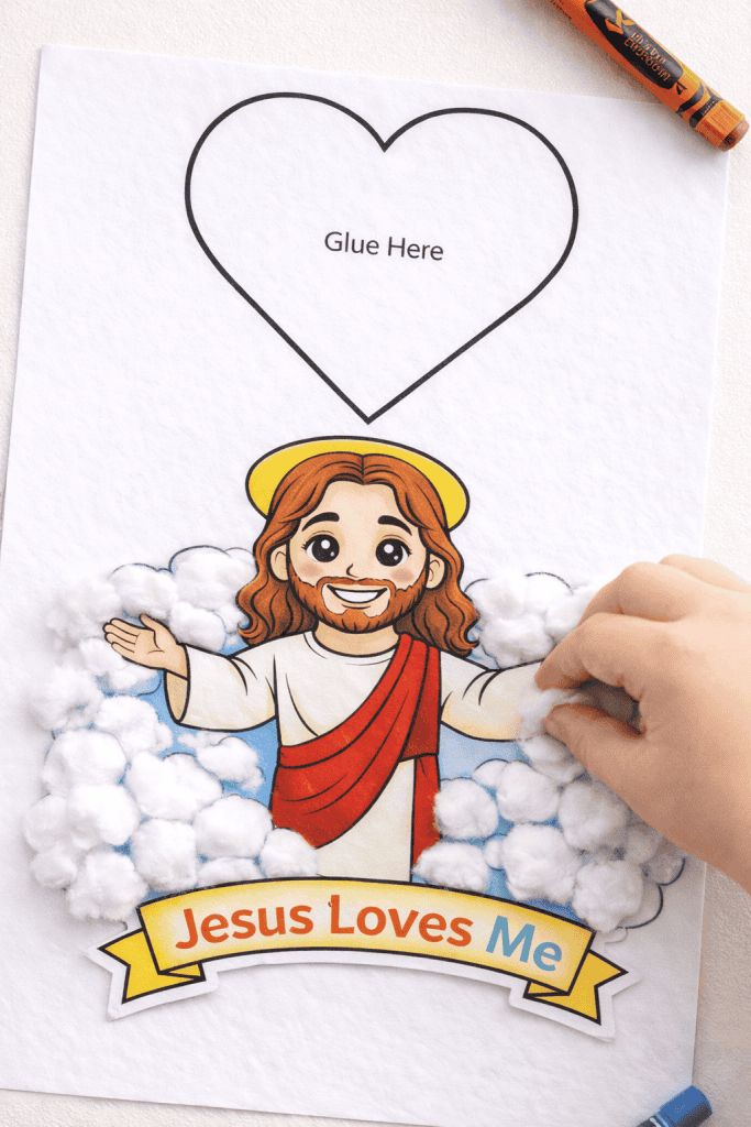 Tip: Repeat this craft or phrases over a few days. The repetition helps toddlers remember the Scripture and the idea of Jesus’ love as something they can feel and see, not just hear.