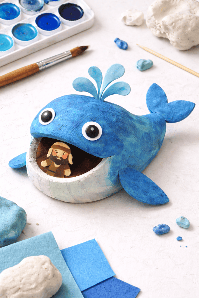 For kids who love working with their hands in a tactile, three-dimensional way, sculpting a whale out of air-dry clay or homemade salt dough is a deeply satisfying project. Shape the whale, press in a little Jonah figure, let it dry, and then paint it in ocean blues, greens, and teals.