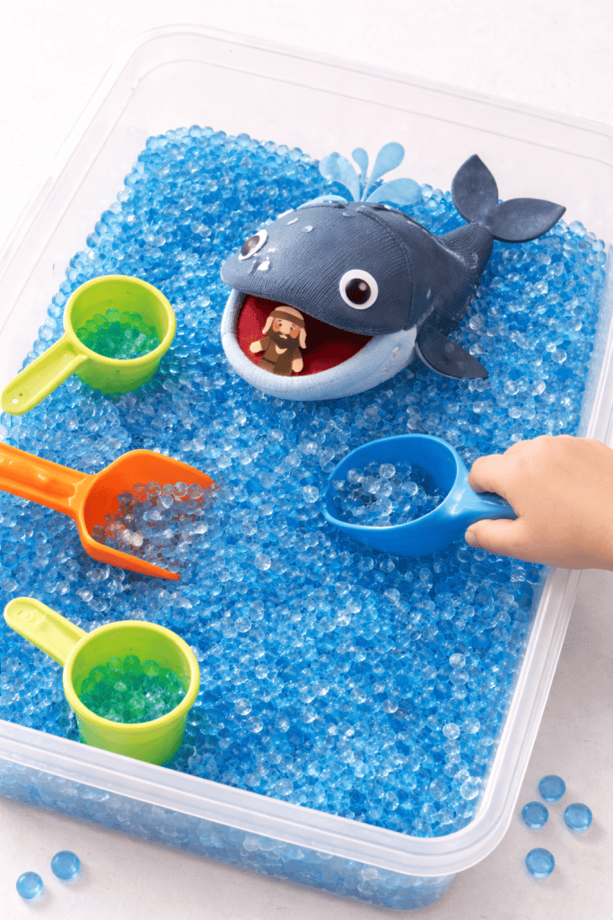 For the littlest learners, a sensory bin is an incredible way to engage multiple senses while exploring a Bible story. Fill a bin with blue water beads or shredded blue paper, tuck in a plastic whale toy, and include small figures to represent Jonah.