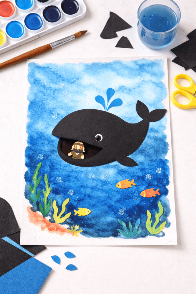 This one is beautiful – and surprisingly easy. Have kids use watercolors to paint a deep blue ocean scene, then add a big whale shape and a small Jonah silhouette using black construction paper cutouts.