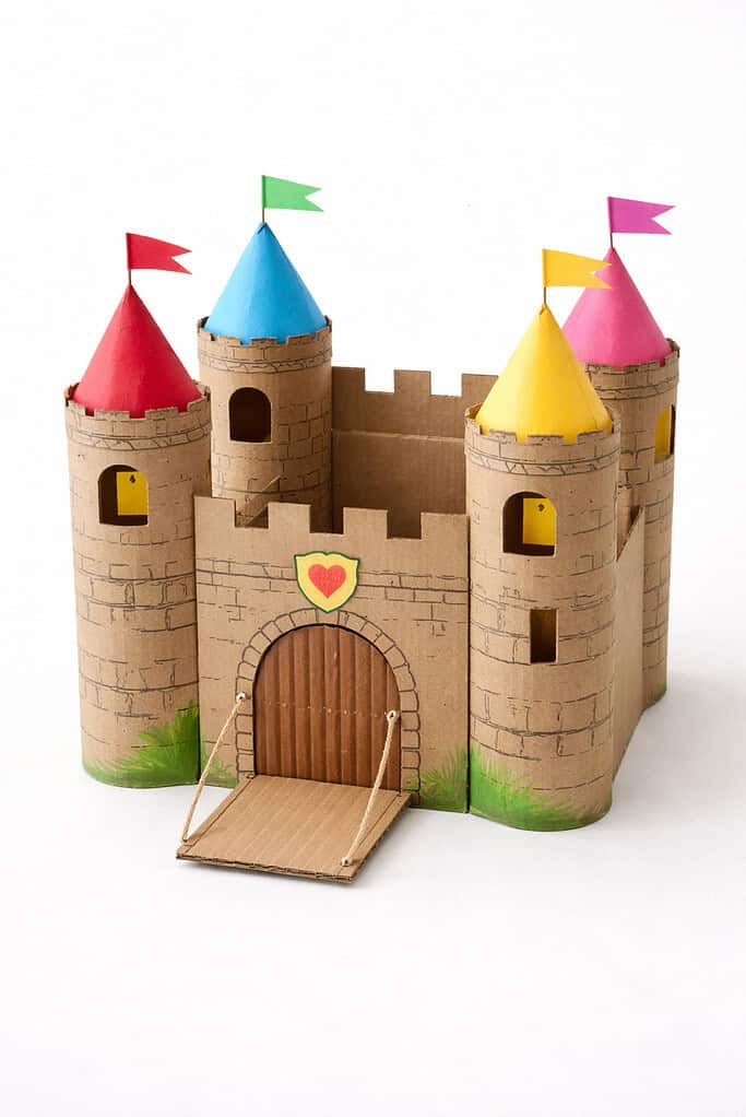 Cut out windows, draw in stone details, add a drawbridge flap, and let the kids paint the turrets. This is a multi-day project that can evolve and grow over time, and it encourages collaborative play when more than one child is involved.