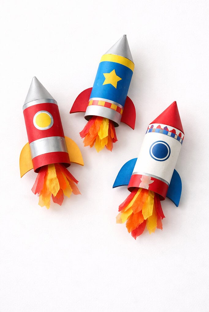 Paper towel rolls are slightly sturdier than toilet rolls and make a wonderful base for a rocket ship craft. Cut out triangular fins from scrap cardboard, tape them to the bottom, create a cone-shaped nose from paper, and add flames cut from red and orange tissue paper or cellophane at the base.