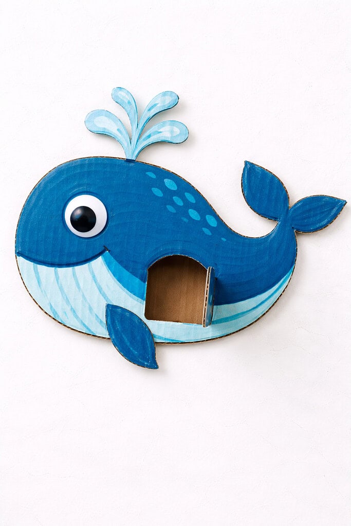 This one is extra special for families who love weaving faith and creativity together. Cut a large whale shape from a flattened cardboard box, paint it in deep blues and teals, and add details like a spout, fins, and a big friendly eye.
