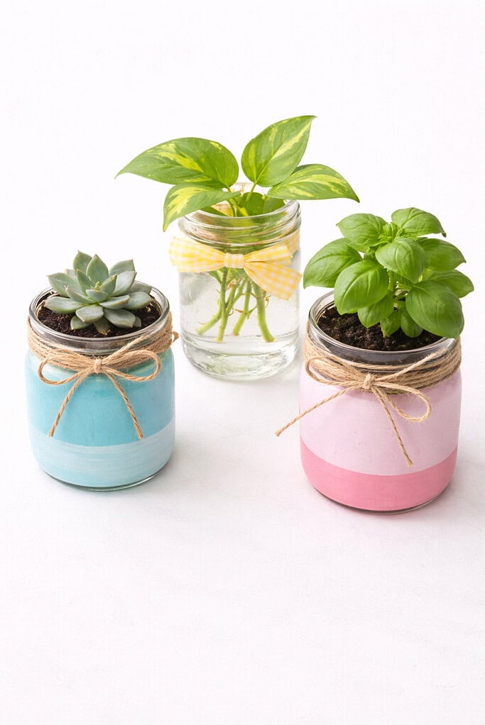 Clean glass jars — pasta sauce, pickle, jam — make the sweetest little planters when given a bit of love. Kids can paint the outside (glass paint works beautifully, but regular acrylic with a sealant coat works too), wrap them in jute twine, or tie on a little fabric bow.