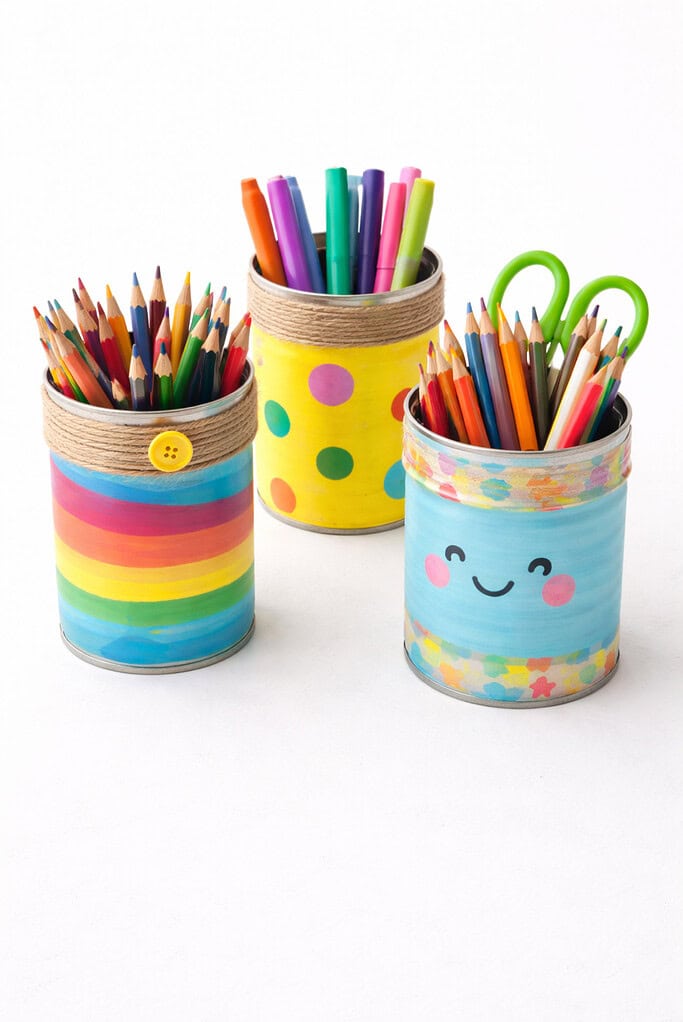 Washed-out tin cans — from beans, tomatoes, or anything else — make beautiful pencil holders with just a little decorating. Kids can wrap them in twine, paint them in their favorite colors, cover them with patterned washi tape, or decoupage them with torn magazine pages.