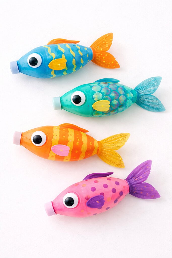 Clear or colored plastic water bottles can be transformed into the most charming little fish with just a few snips and some paint. Cut the tail shape into the bottom of the bottle, paint the outside in vibrant ocean colors, add a big googly eye, and let it dry.