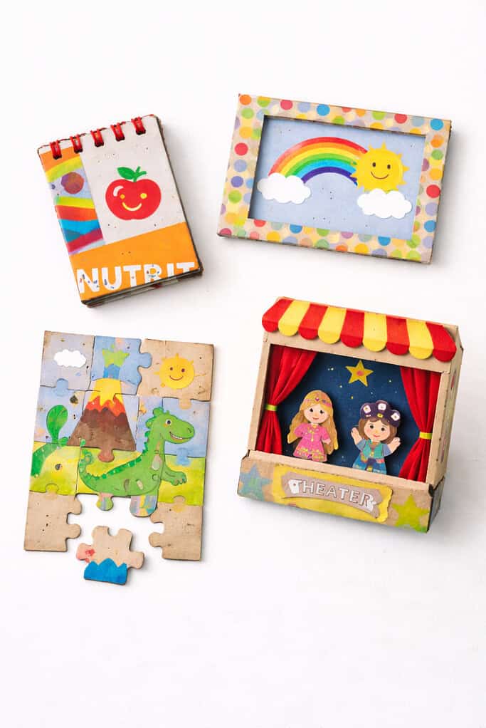 Recycled crafts also tend to reduce the pressure that can come with “nice” craft supplies. When you’re working with a cereal box instead of a pristine sheet of cardstock, there’s less anxiety about making mistakes.
